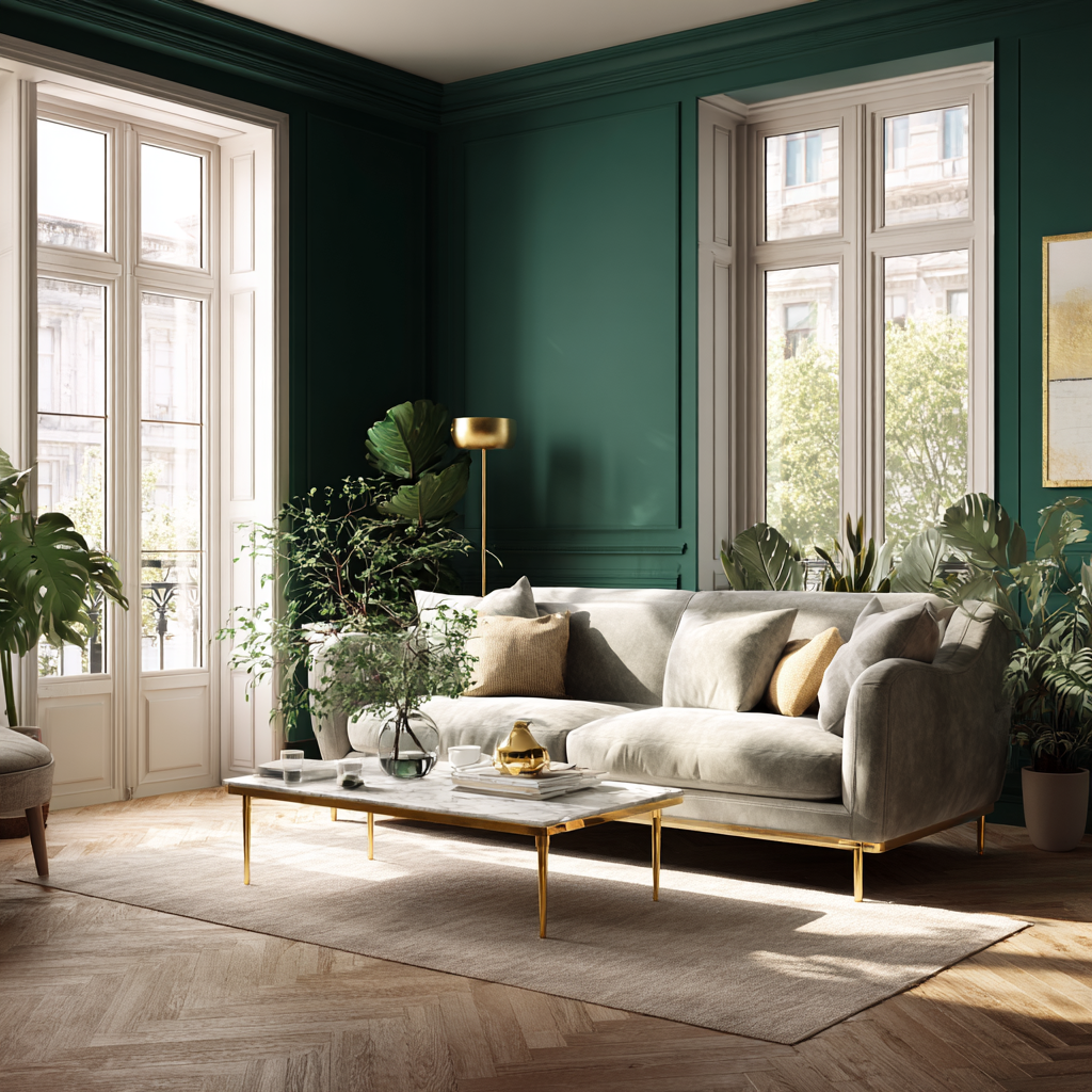 • Alternatywnie: butelkowa zieleń na wszystkich ścianach (60%), jasna sofa z lnianymi zasłonami (30%), czarne ramy i aksamitne poduszki (10%)